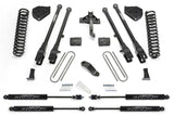 Fabtech?s 6" 4 Link Conversion system for the Ford F450 and F550 Super Duty is built to handle the on and offroad demands of the truck enthusiast. This vehicle?s suspension is more robust than the Ford F250 and F350 and therefore demands specialty parts only available from Fabtech. This system comes with everything needed to convert to a 4 Link front suspension. The system will provide less caster change throughout the travel range which benefits on road driving. Offroad the 4 Link system will provide more articulation than a Radius Arm for increased terrain traversing at all speeds. Fabtech?s 4 Link System has been proven in over 10 years of service in consumer, commercial and military applications. High quality components with properly design suspension geometry is the pinnacle of Super Duty suspension systems. Each Fabtech component is expertly built in house and has specific design features and benefits as listed below. FEATURES: LINK ARMS & BRACKETS - 2" OD Heavy wall link arms have 1/4" thick steel brackets at the axle with adjustable alignment cams and Fabtech?s legendary 5 Ton joints? to pivot at the frame for an extended service life. The 5 Ton joints? have been proven in military use for over 10 years and are quiet and strong. The 4 Link Arms attach to stout 1/4" thick steel frame brackets for a solid mounting of the new suspension. The geometry of the 4 Link arms and frame brackets has been designed to provide an improved highway ride due to reduced caster change and able to tackle rough offroad conditions better than a Radius Arm suspension. COIL SPRINGS - American made coil springs have been designed for a very compliant ride quality both on and offroad. Each coil is preset during the manufacturing process to insure no ride height settling over time. Allows for a 2" increase in wheel travel over stock when used with Fabtech shock absorbers. TRACK BAR BRACKET - 1/4" thick steel bracketry rep-ositions the factory track bar to center the axle under